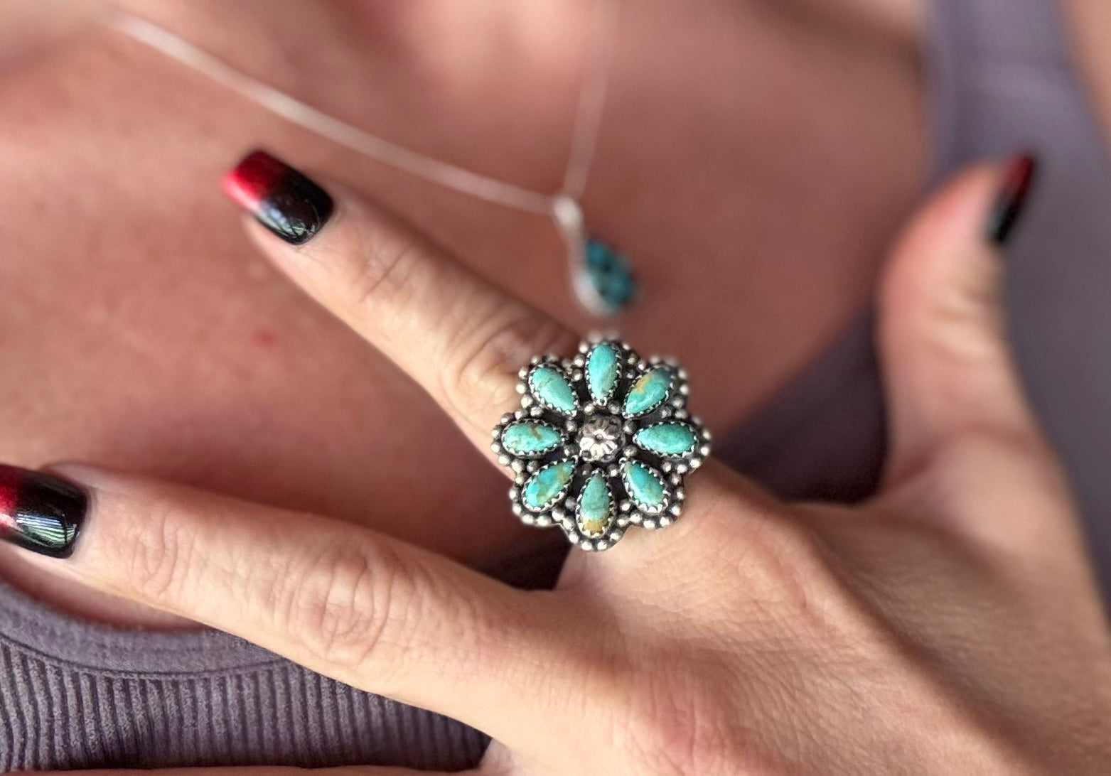 This Extra Large Kingman Cluster ring features meticulously crafted band work in genuine 925 sterling silver, showcasing stunning Kingman turquoise stones known for their vibrant blue hues. Designed with an adjustable band, it offers a precise fit while making a bold statement. Perfect for collectors and connoisseurs, this piece highlights expert craftsmanship and the natural beauty of Kingman turquoise.