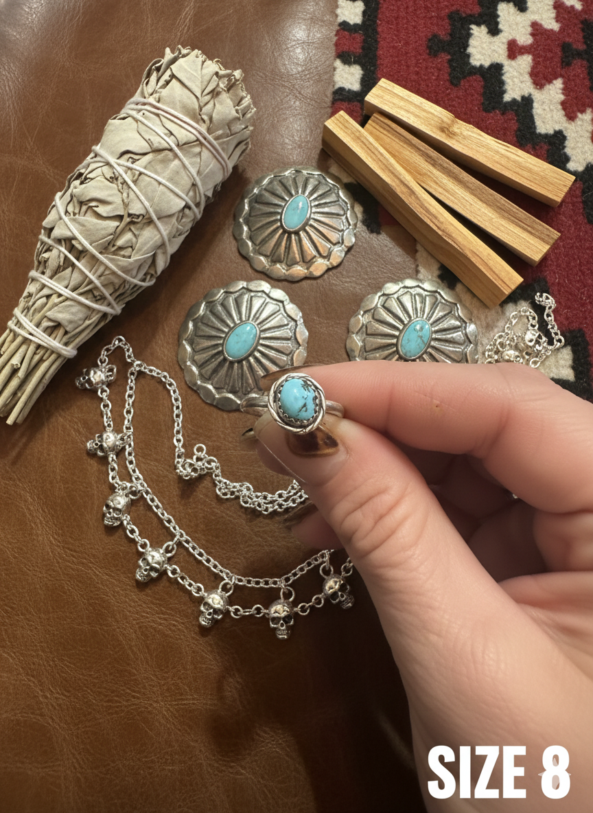 Crafted with precision, the Morenci Navajo Ring features a striking round Morenci turquoise stone set on a hand-forged 925 sterling silver band. Size 8, this piece showcases traditional Navajo silversmithing techniques, combining durability with authentic artistry. Ideal for collectors and enthusiasts, it offers both timeless beauty and cultural significance in one elegant accessory.